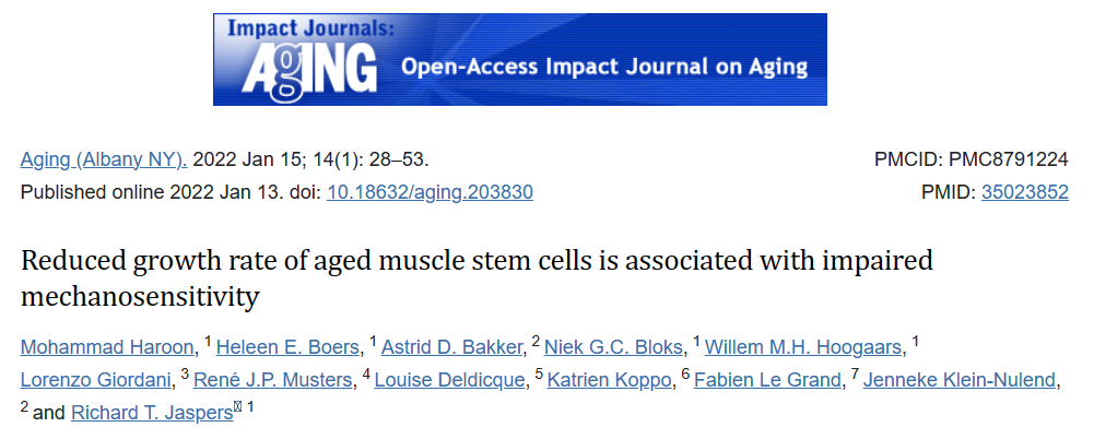 參考文獻:Haroon M, Boers HE, Bakker AD, Bloks NGC, Hoogaars WMH, Giordani L, Musters RJP, Deldicque L, Koppo K, Le Grand F, Klein-Nulend J, Jaspers RT. Reduced growth rate of aged muscle stem cells is associated with impaired mechanosensitivity. Aging (Albany NY). 2022 Jan 13;14(1):28-53. doi: 10.18632/aging.203830. Epub 2022 Jan 13. PMID: 35023852; PMCID: PMC8791224.