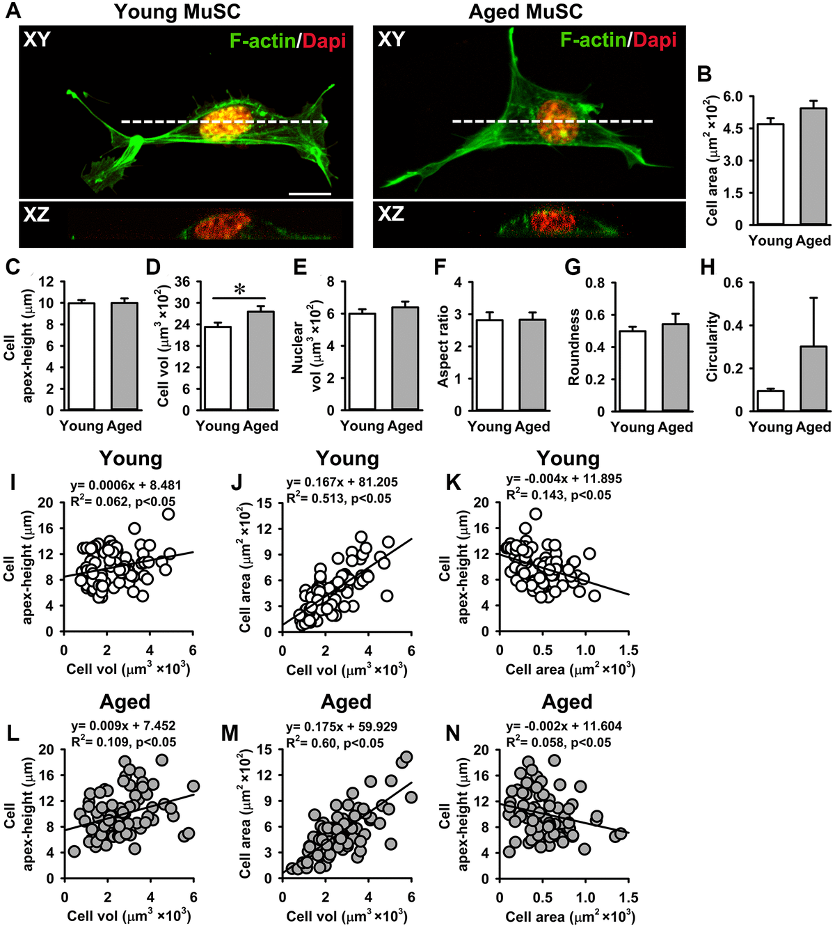 (A)培養(yǎng) 3 天的年輕和老化 MuSCs 的俯視圖(XY)和橫截面圖像(XZ,白色虛線),并染色 F-肌動蛋白絲(綠色)和細胞核(紅色)以量化細胞形態(tài)測量。(B、C)MuSCs在基質(zhì)膠涂層玻璃基板上的細胞擴散面積和細胞頂點高度。(D、E)老化MuSCs表現(xiàn)出比年輕MuSC大18%的細胞體積,而核體積沒有差異。(F-H)年輕和老化MuSC之間的細胞形狀描述符沒有差異。(I-N)年輕和老化MuSCs的細胞頂點高度,細胞體積和細胞面積之間的相關(guān)性。