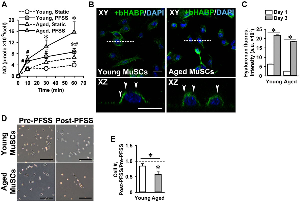 圖2 PFSS誘導(dǎo)的NO產(chǎn)生和MuSC脫附。(A)PFSS誘導(dǎo)年輕和老化MuSC產(chǎn)生NO。PFSS效果顯著,與靜態(tài)對照差異顯著。(B)透明質(zhì)酸(糖萼成分,綠色)和細胞核(藍色)染色的MuSC。俯視圖(XY)和橫截面圖像(XZ,白色虛線)顯示年輕和老化MuSCs表達糖萼(白色箭頭)。(C)培養(yǎng)第一天和第三天年輕和老化MuSC中的糖萼表達。(D)PFSS處理前后MuSCs的顯微照片顯示老化MuSCs的數(shù)量下降。(E)在1小時PFSS期間(4.13 Pa/s),43%的老化MuSC從基質(zhì)膠涂層的載玻片上脫附。