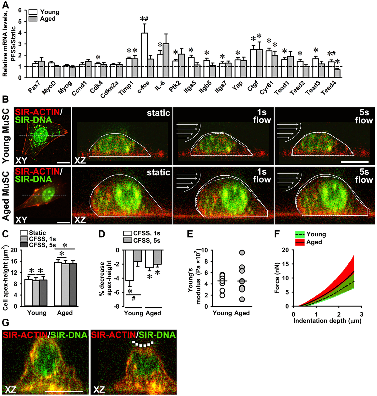 圖3 老化MuSC對PFSS的機械敏感性減弱。(A)響應(yīng)PFSS的MuSC基因表達。(B)在流體剪切應(yīng)力處理之前(靜態(tài))和期間染色的年輕和老化 MuSC 的共聚焦俯視圖 (XY) 和橫截面 (XZ) 活細胞圖像,用于 F-肌動蛋白絲(紅色)和細胞核(綠色),說明由于流體剪切應(yīng)力而導(dǎo)致細胞頂點高度的變化。(C、D)在CFSS處理開始時,CFSS誘導(dǎo)MuSC變形并降低年輕和老化MuSCs的細胞頂點高度。(E)年輕和老化的MuSCs具有相似的楊氏模量(~450Pa)。與年輕MuSC(27%)相比,老化MuSCs(61%)的變異系數(shù)較大。(F)力壓痕曲線顯示,與年輕的 MuSC 相比,壓痕老化 MuSC 所需的力變化很大。(G)納米壓痕之前和期間染色 F-肌動蛋白絲(紅色)和細胞核(綠色)的年輕 MuSC 的共聚焦橫截面顯微照片,說明細胞變形(虛線)。